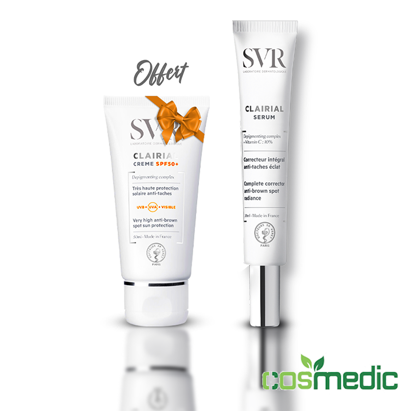 L’hyperpigmentation cutanée nécessite deux actions complémentaires : réduire l’excès de mélanine et protéger la peau des UV responsables de la réapparition des taches. Le coffret SVR Clairial réunit ces deux étapes essentielles pour une efficacité durable.