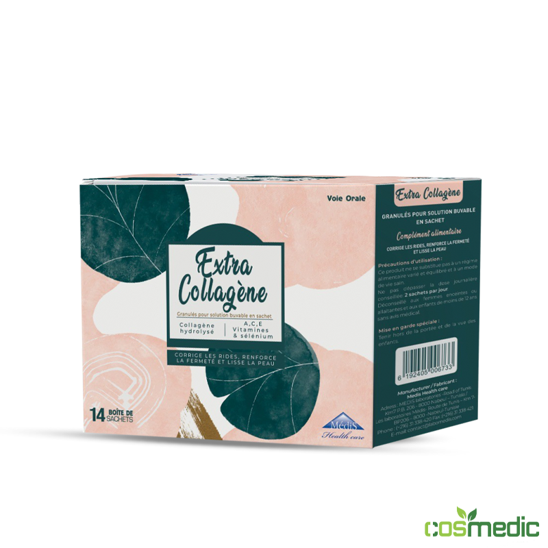 Description : Ce complément alimentaire buvable, hautement concentré en collagène hydrolysé de haute qualité, agit en profondeur pour soutenir la structure et l’élasticité de la peau. Sa synergie unique de vitamines A, C, E et de sélénium offre une action antioxydante puissante, protégeant les cellules contre le stress oxydatif, l’un des principaux facteurs du vieillissement cutané. Résultats visibles : Peau plus ferme : le collagène contribue à renforcer la densité et la souplesse de la peau. Hydratation en profondeur : favorise la rétention d’eau et améliore le confort cutané. Teint éclatant : les antioxydants révèlent l’éclat naturel et uniforme de votre peau. Protection cellulaire : lutte contre les agressions extérieures et les signes de l’âge. EXTRA COLLAGÈNE 10 000 mg de collagène Révélez la lumière de votre peau Complément alimentaire buvable fortement dosé en collagène hydrolysé, enrichi en vitamines A, C, E et en sélénium, pour une peau plus ferme, hydratée, éclatante. Avantages : Action anti-ride Corrige les rides, effet visible à l’œil nue à partir de 5 gr Élasticité cutanée Augmentation significative de l’élasticité Hydratation profonde Le Collagène améliore la rétention d’eau dans les tissus Action antioxydante Grâce aux vitamines C, E et au sélénium Peau plus lumineuse Effet “bonne mine” et éclat du teint Texture lisse et douce Résultats visibles dès 90 jours (étude pattes d’oie) Conseils D’utilisation : Quelle est la posologie recommandée ? 1 à 2 sachets par jour à diluer dans un verre d’eau. À consommer de préférence le matin. Quand verrai-je les premiers résultats ? Les premiers effets (éclat, confort, hydratation) peuvent apparaître dès 14 jours. L'effet anti-rides est visible à l’œil nu après 90 jours d'utilisation continue. Ce produit est-il adapté aux peaux sensibles ? Oui, la formule est sans gluten ni lactose. Elle est bien tolérée. Déconseillé aux personnes allergiques aux protéines animales. Convient-il aux femmes enceintes ou allaitantes ? Par précaution, consulter un professionnel de santé avant toute supplémentation pendant la grossesse ou l’allaitement. Le collagène est-il d’origine marine ? Non. Extra Collagène utilise du collagène hydrolysé bovin de haute qualité. Moins allergisant et Halal Composition : Ingrédients actifs (par 2 sachets) … Collagène hydrolysé bovin : 10 000 mg Vitamine C : 80 mg Vitamine E : 12 mg Vitamine A : 800 µg Sélénium : 50 µg