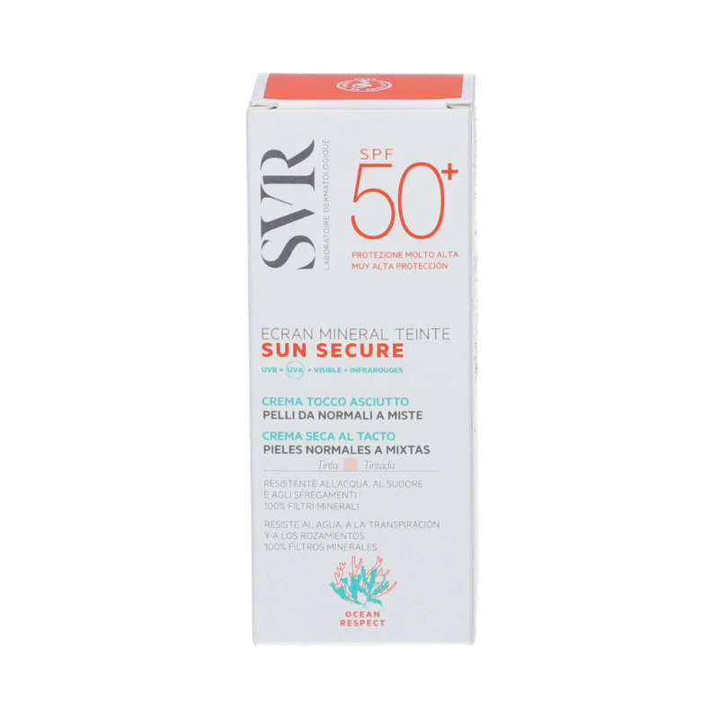 SVR Sun Secure Minéral SPF 50+ Teinté – Peaux normales à mixtes est un soin solaire dermatologique haute tolérance, formulé pour répondre aux besoins des peaux sensibles, réactives ou intolérantes aux filtres solaires chimiques. Il associe une protection solaire maximale à une action perfectrice du teint.