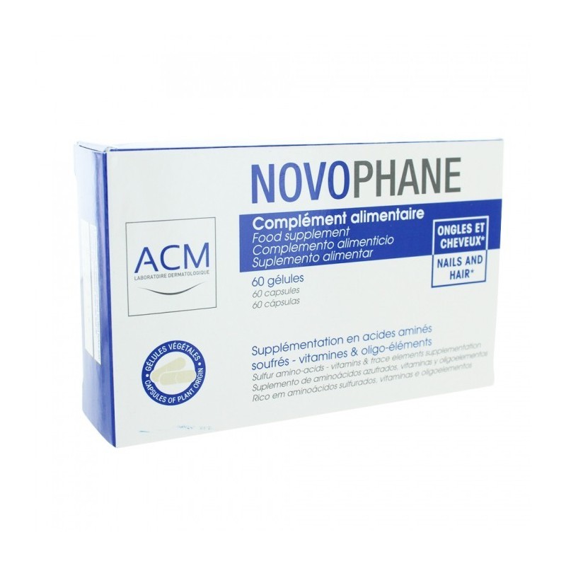 ACM Novophane Gélules 60 est un complément alimentaire développé par les laboratoires ACM pour répondre aux besoins des cheveux et ongles fragiles, ternes ou sujets à la chute.