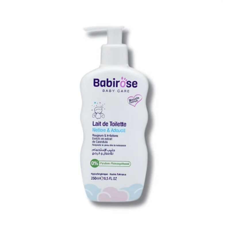 Babirose Lait de Toilette 250 ml est spécialement formulé pour assurer une toilette douce et sécurisée de la peau sensible des nourrissons et jeunes enfants.