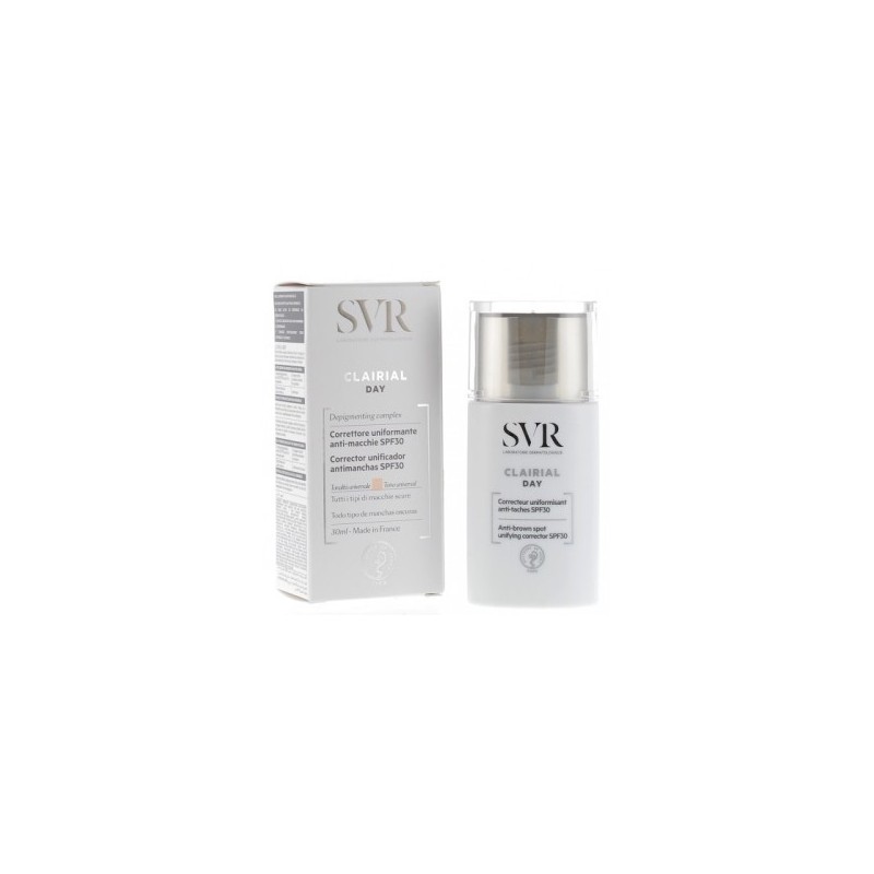 SVR Clairial Day SPF30+ est une crème anti-tache quotidienne qui aide à corriger et prévenir les taches pigmentaires tout en protégeant la peau des UV. Sa formule associe actifs dépigmentants et protection solaire pour limiter le photo-vieillissement et l’apparition de nouvelles irrégularités. Elle hydrate, unifie le teint et améliore progressivement l’éclat de la peau. Adaptée aux peaux sensibles, elle constitue un soin de jour idéal pour un teint plus homogène.