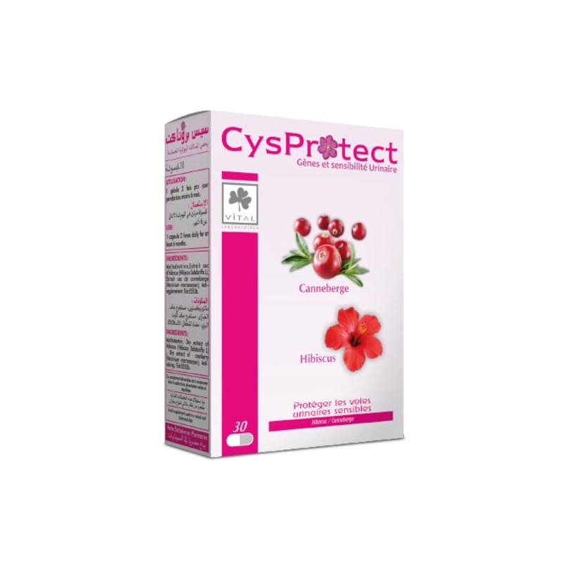 VITAL Cysprotect BT 30 Gélules est un complément alimentaire formulé pour soutenir le confort urinaire et protéger les voies urinaires. Enrichi en extraits végétaux reconnus et en actifs spécifiques, il aide à maintenir l’équilibre urinaire, favoriser l’élimination et contribuer au bien-être intime au quotidien.